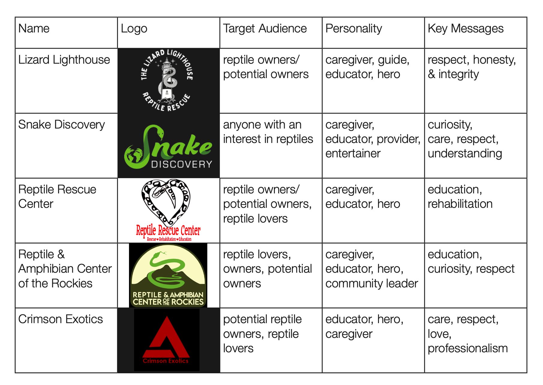 I researched several reptile rescue organizations and adoption centers, assessing their target audiences, brand personalities, and key messages.